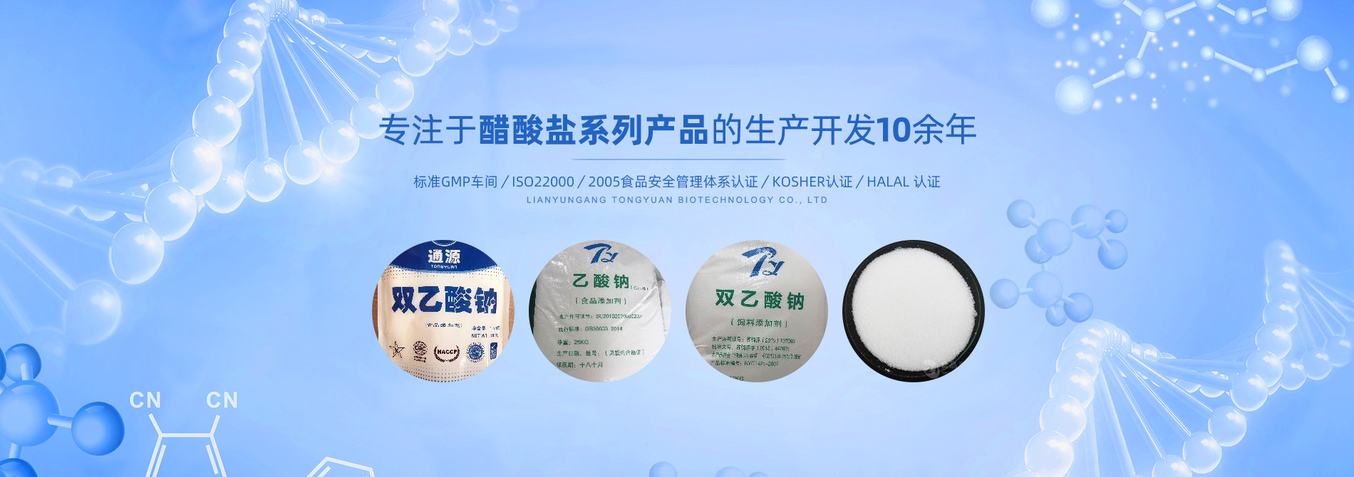 連云港市通源生物科技有限公司 是生產雙乙酸鈉、無水醋酸鈉、三水醋酸鈉、醋酸鉀、乙酸鈉、丙酸鈉、丙酸鈣和氯化鉀等系類醋酸鹽產品的專業制造商。公司專注于醋酸鹽系列產品的生產開發10余年,是國內專業醋酸酸鹽產品生產基地?! ∧壳埃覀円押腿?0多個國家和地區建立長期的業務合作關系,是中國較大的雙乙酸鈉生產商和出口商之一。作為中國食品添加劑和配料協會理事單位,通源公司已建成標準GMP車間5000余平方米,通過了ISO22000:2005食品安全管理體系認證、KOSHER認證、HALAL 認證等,這些都是我們提供高質量產品和優良服務的前提和確保。 生產出色產品,提供優良服務,滿足顧客需要,是我們努力的目標。愿和我們的朋友們攜手,共...